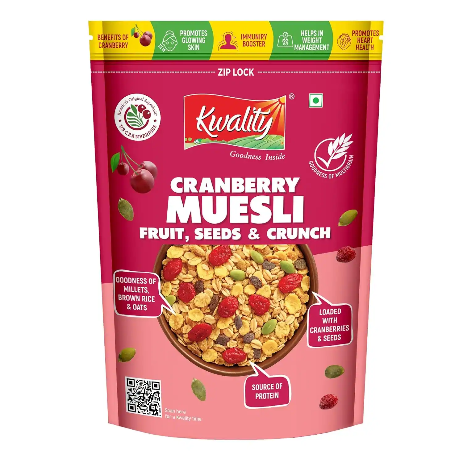 Enjoy a delicious and nutritious start with Kwality Foods Cranberry Muesli 400g. Made with wholesome grains, crunchy nuts, and sweet-tangy cranberries, it offers the perfect balance of taste and health. Rich in fiber and essential nutrients, this muesli supports a healthy lifestyle while keeping you energized throughout the day. A convenient and tasty breakfast option for the whole family.