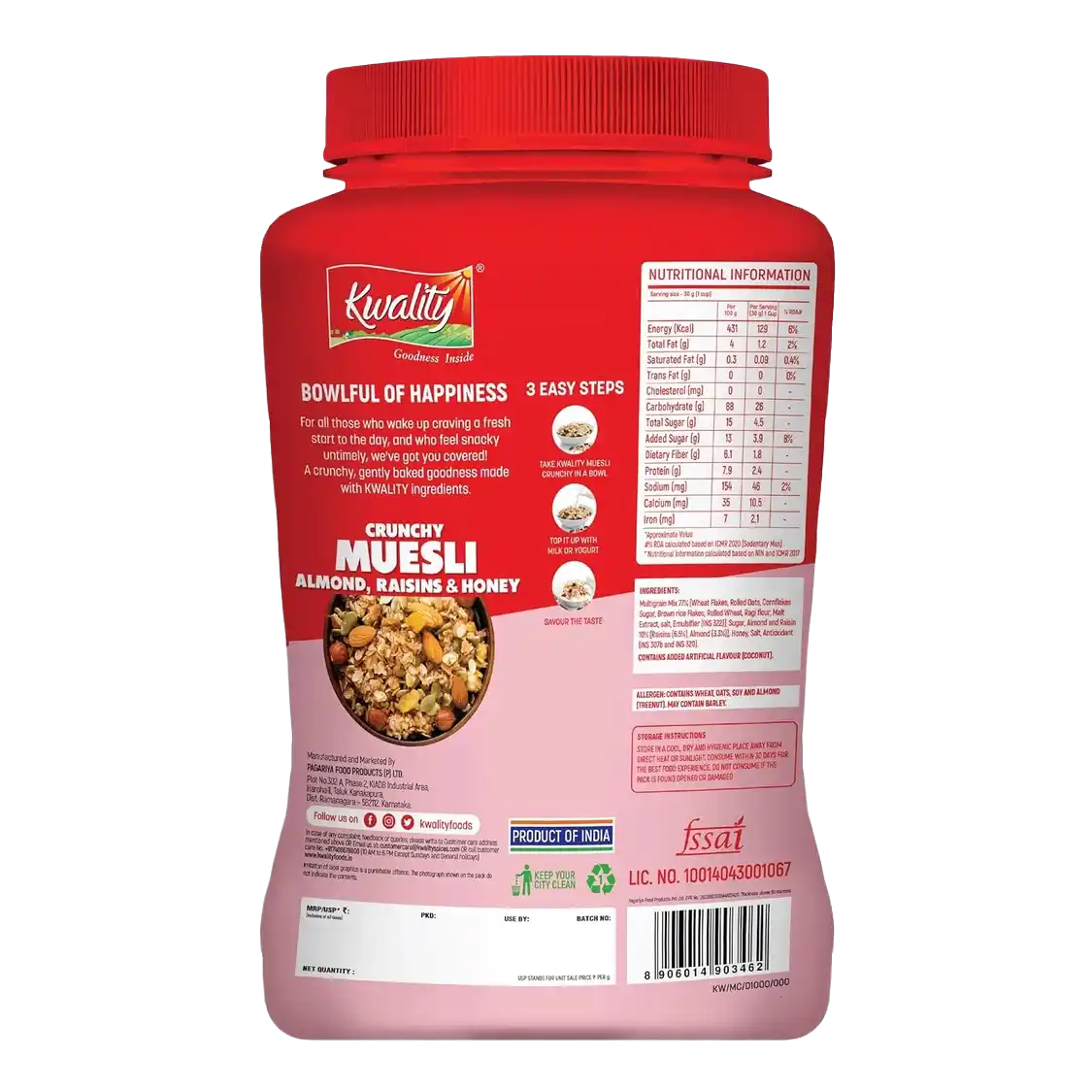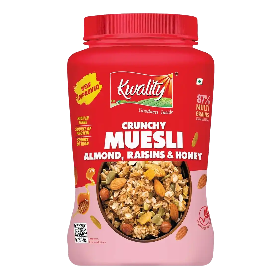 Kwality Crunchy Muesli Almonds & Raisins comes with the goodness of multigrain, oats, honey, corn flakes, Californian almonds, and raisins.